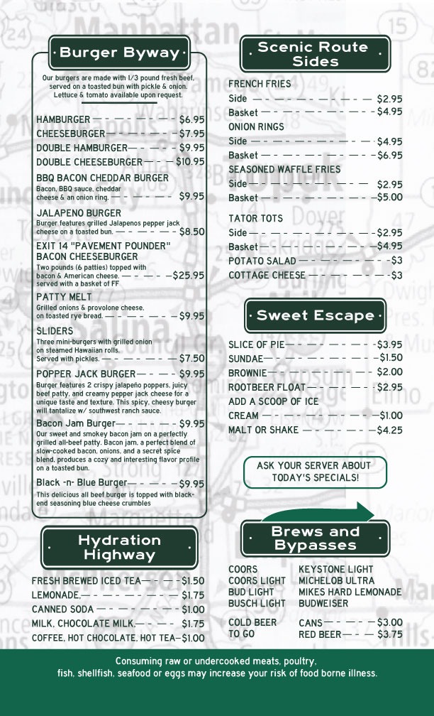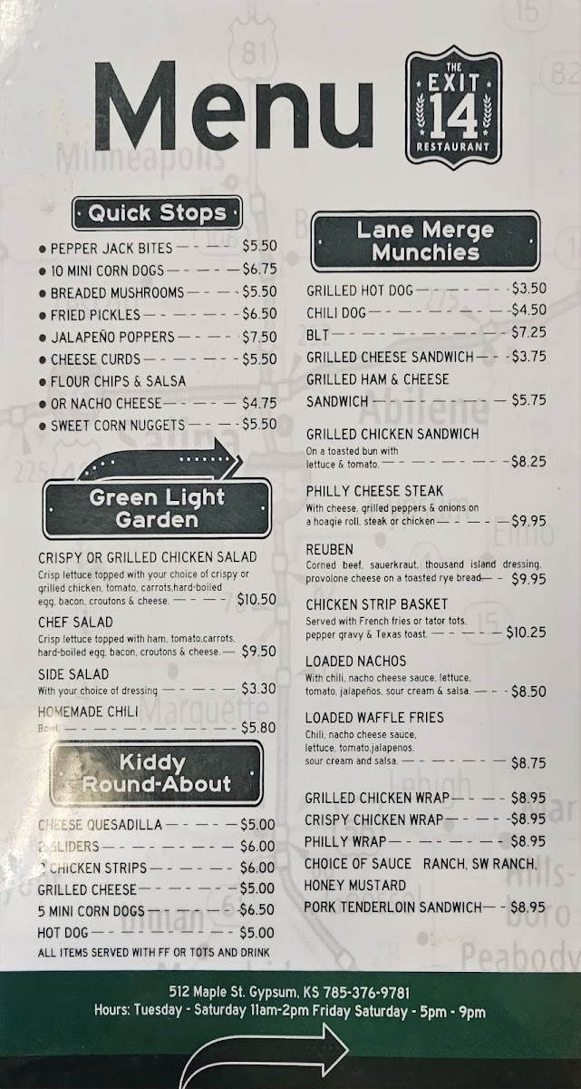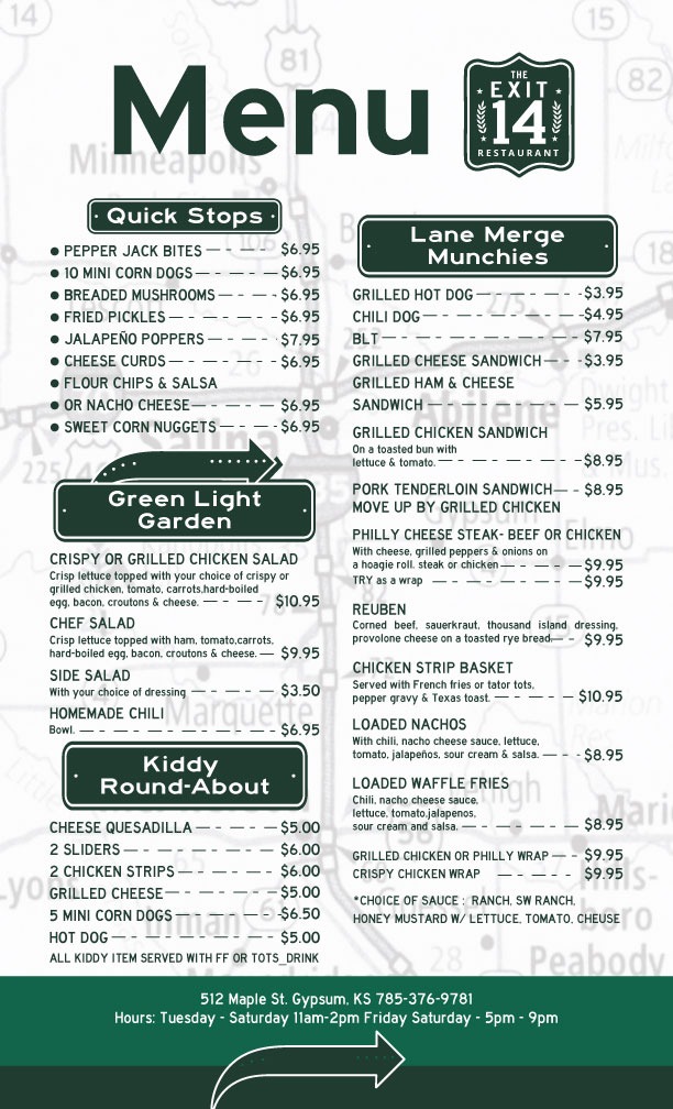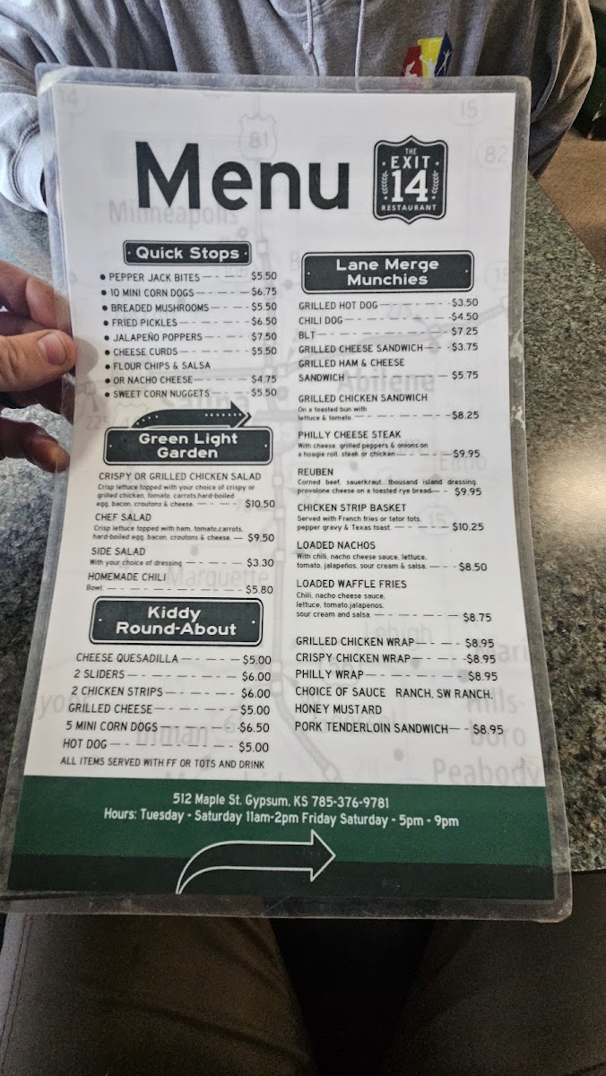 Viewed as a complete menu experience, The Exit 14 Restaurant delivers a lineup that feels comforting, indulgent, and intentionally straightforward, making it easy to see why these dishes stand out. Burgers clearly anchor the menu, with the Exit 14 Cheeseburger representing the house style, while the Double Cheeseburger, Jalapeno Cheeseburger, and Jalapeno Popper Cheeseburger build on that foundation with richer layers of cheese and heat that appeal to classic American burger fans. Sandwich lovers are well served too, especially with the French Dip Sandwich, which adds variety without straying from the restaurant’s hearty identity. On the appetizer side, Cheese Curds work as a familiar, shareable option that complements the heavier mains, while the Chicken Wrap provides a slightly lighter but still satisfying alternative. The menu also shows flexibility with comfort classics like Tacos, offering a casual, flavorful break from burgers, and the Saturday Breakfast Omelette, which highlights that the kitchen performs just as confidently during breakfast hours. To finish on a sweet or nostalgic note, desserts and drinks such as Coconut Pie and the Root Beer Float round out the menu with a sense of fun and balance. Taken together, these standout items reflect a menu built around approachability, generous portions, and recognizable flavors, creating a cohesive dining experience that feels consistent from the first bite to the last.
